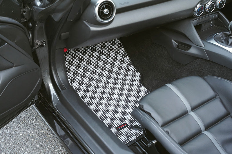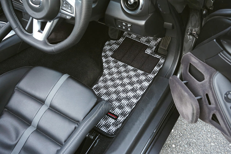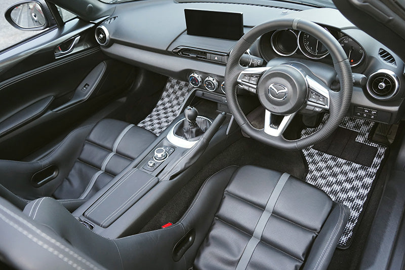 グラデーションが印象的な高品位フロアマットセットがリニューアル。素材には再生ペット由来の繊維を採用し、環境への配慮と上質感を両立。糸量を増やした高密度ループ織により、従来以上のボリューム感ある踏み心地を実現。再生ペット繊維ならではの優れた発色性により、グラデーションはより鮮やかに。撥水性も向上し、汚れに強く日常使いでも美しさをキープする。さらに運転席には、スポーツドライビングにおいてもペダルワークを正確に支援する硬質繊維製の大型ヒールパッドを装備。質感・耐久性・ダイレクト感を高次元で融合した。また、運転席・助手席両サイドにはアルミ製AutoExeロゴプレートをレイアウトし、インテリアにスポーティな華やぎをプラス。専用スポーツステアリングホイールなどと共にリフレッシュを兼ねたコクピットのチューニングに最適である。新たにNDロードスター専用にグレー×ブラックのカラーバリエーションを加えた。