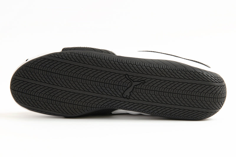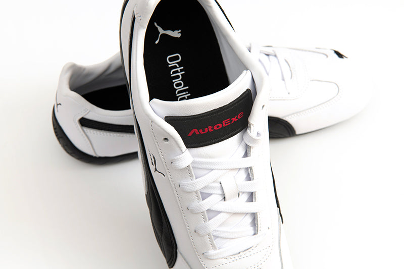 今回はシューズ本体にホワイトレザーを採用したスピードキャットに、シュータンには黒ベースに赤のAutoExeロゴを配置。